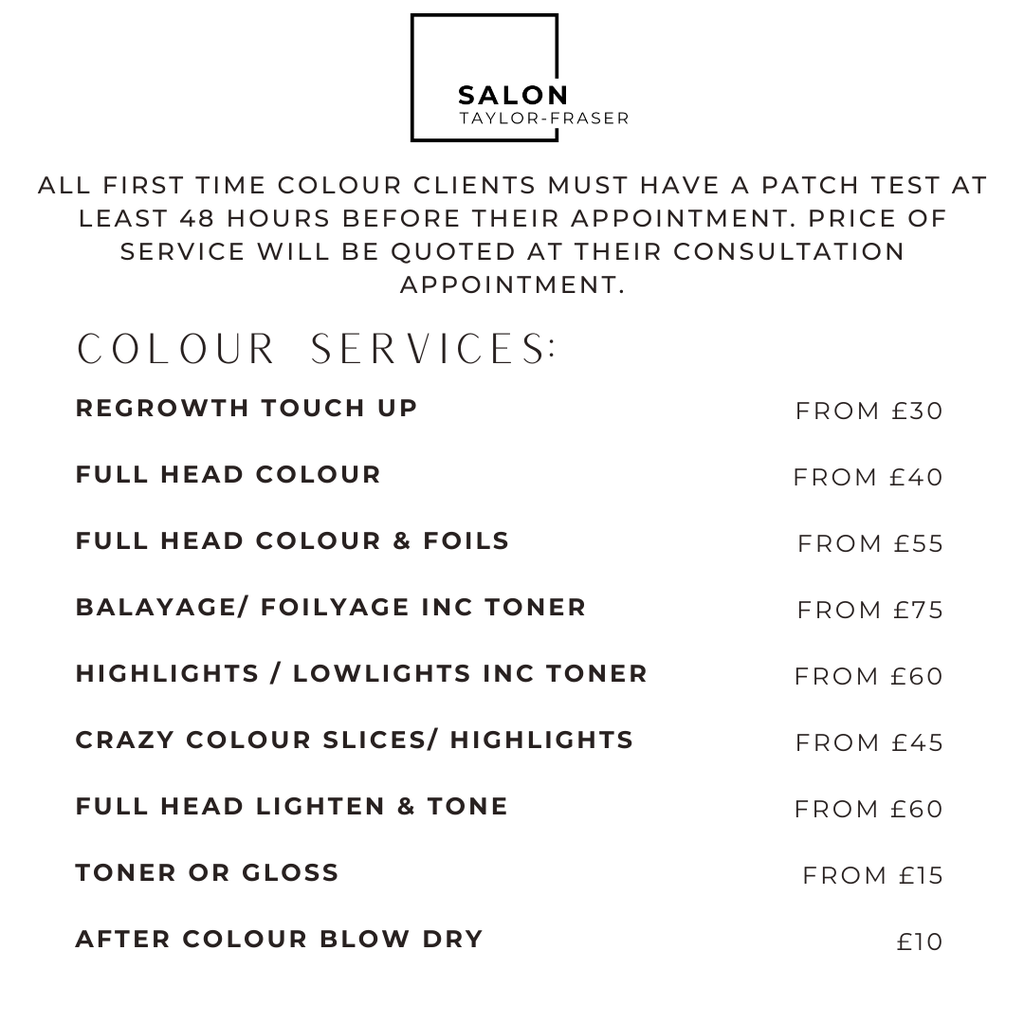Book a free consultation and lets have a conversation on what service is best for you, all first colour services need to be patch tested at least 48 hours before, this will be done during your consultation appointment. All prices are a guide and will be tailored to hair length and service required.